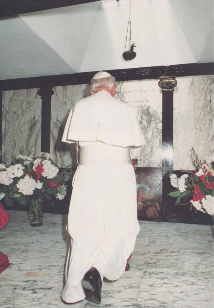 O Papa João Paulo II reza diante de sepultura de Pier Giorgio Frassati no cemitério de Pollone ( Pier Giorgio ainda era Venerável)