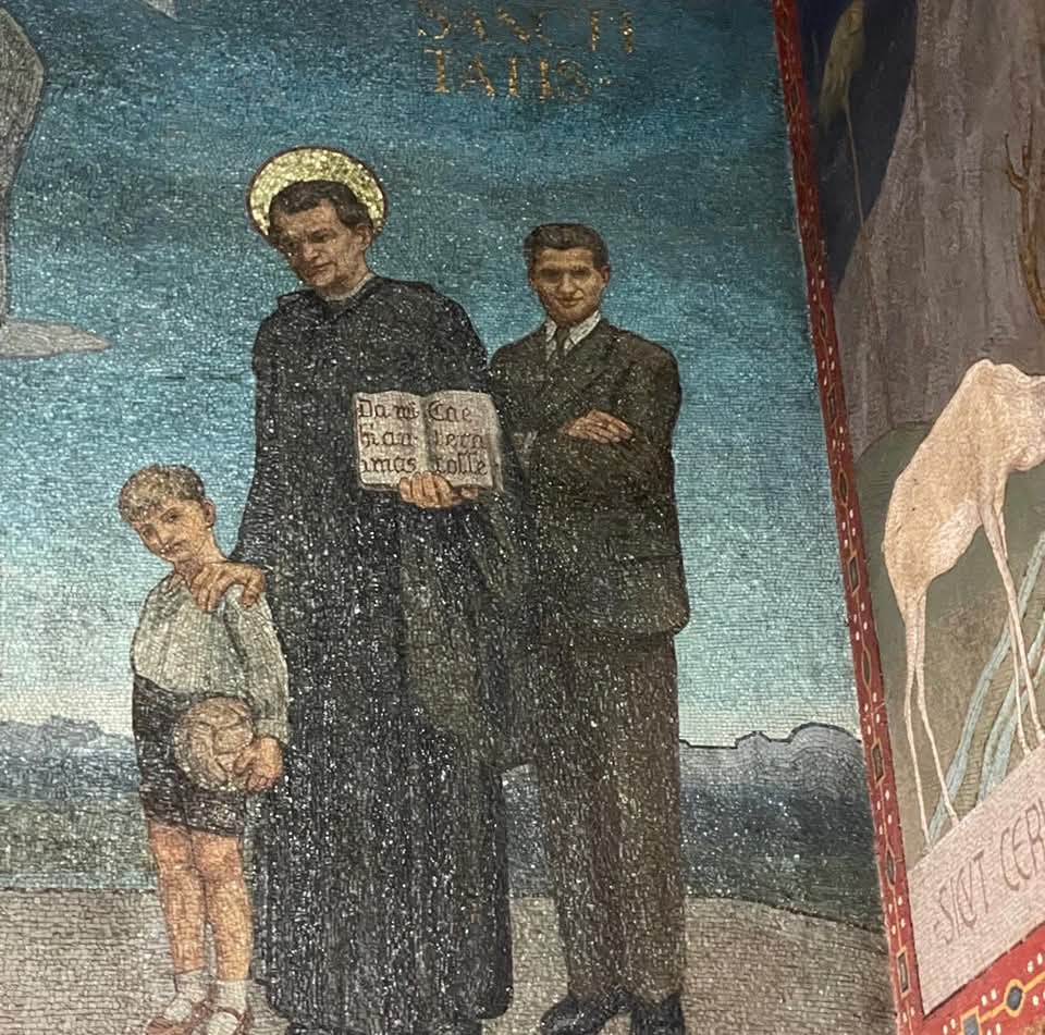 (Na foto o mosaico situado na Igreja da Madonna delle Grazie alla Crocetta que retrata São João Bosco com São Pier Giorgio Frassati. No arquivo da Igreja está conservado a certidão de batismo de Pier Giorgio)